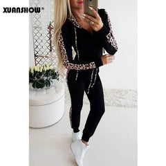 XUANSHOW Autumn Winter Fashion Tracksuit Women Splice Fleece Leopard Print Coat with Hood Two Pieces Set Hoodies Long Pants Suit
