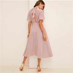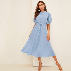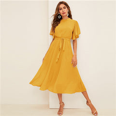 SHEIN Flutter Sleeve Swiss Dot Belted Dress Elegant Pink Pastel Solid Women Dresses Stand Collar A Line Half Sleeve Dresses
