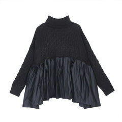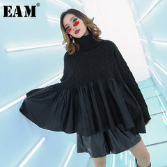 [EAM] Black Pleated Big Size Knitting Sweater Loose Fit High Collar Long Sleeve Women New Fashion Tide Autumn Winter 2019 1B311