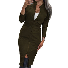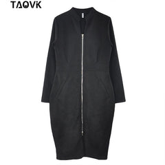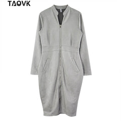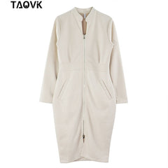 TAOVK High Street Suede Dress Women Long Sleeve Bodycon Zippers Dress Vintage Stand Collar Office Lady Dresses